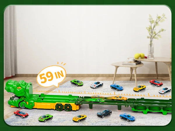 59in Foldable And Catapult Dinosaur Transport Truck Toys With 12 Die-Cast Racing Cars For Kids 3-8 Age Birthday Gift Toys Sets