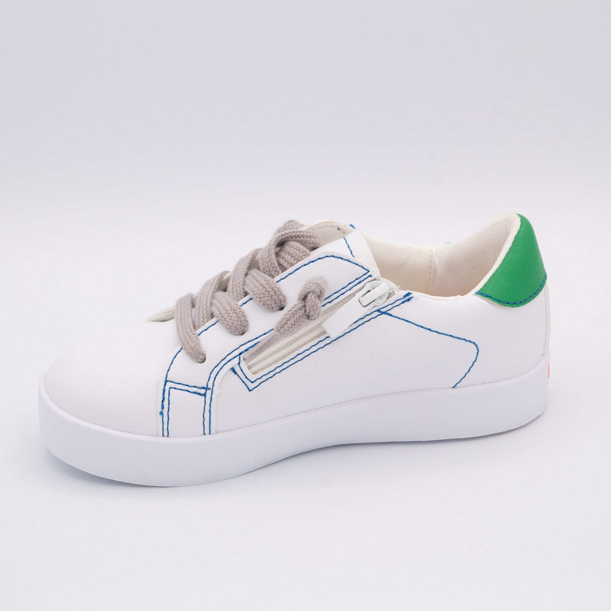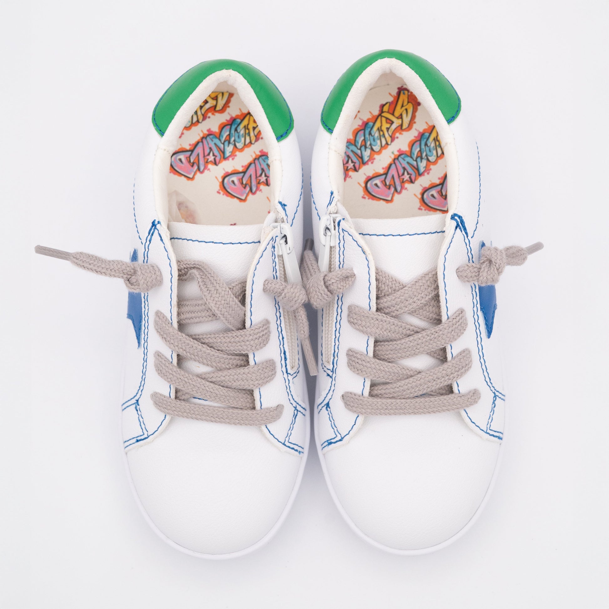 • White PU leather upper; blue leather star patch on the side; green leather heel grip