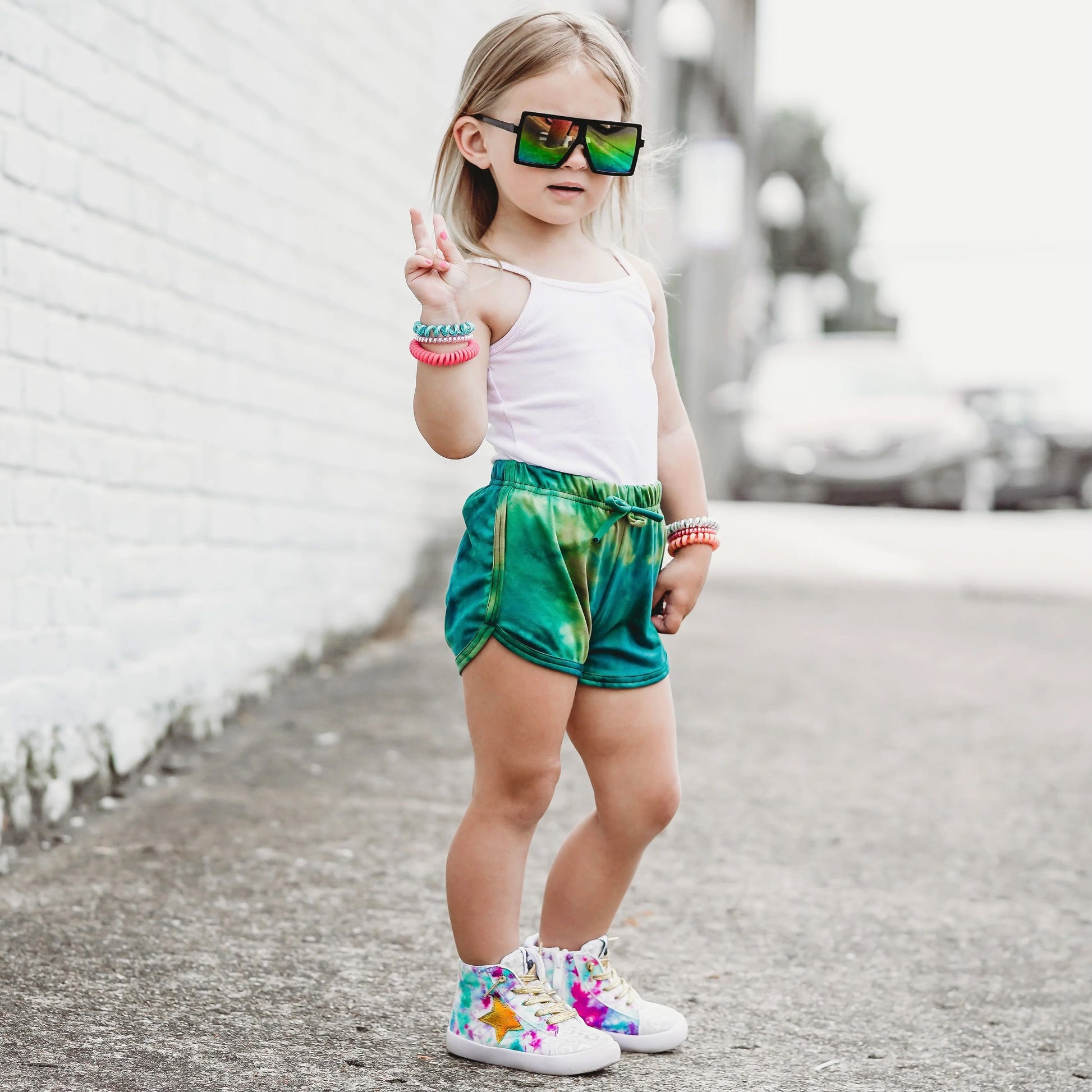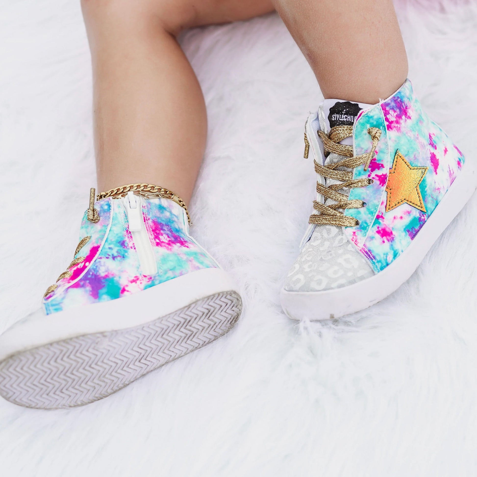 - Tie-dye suede upper; Gold metallic star and shoe3 laces and silver metallic glitter leopard cap-toe and tongue
