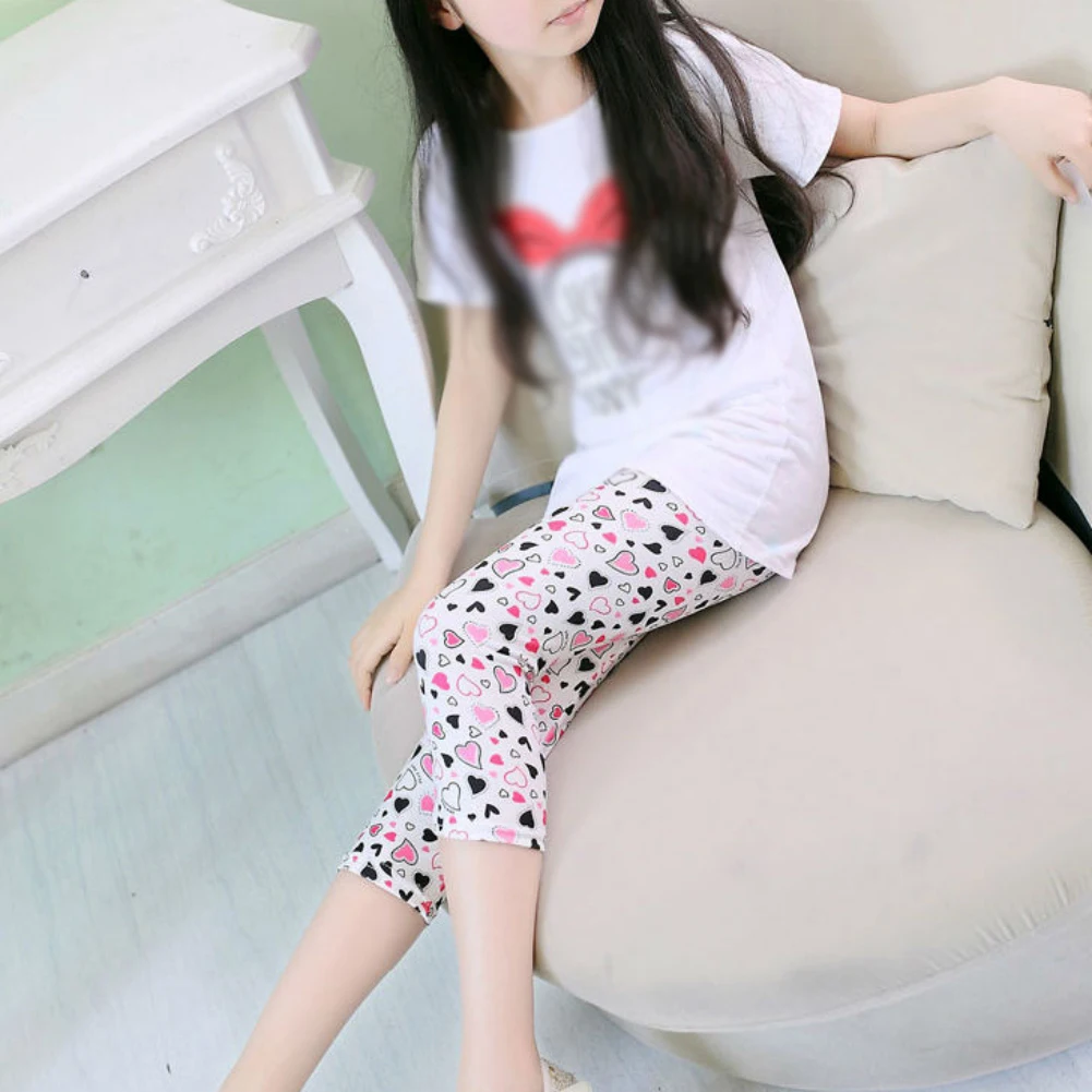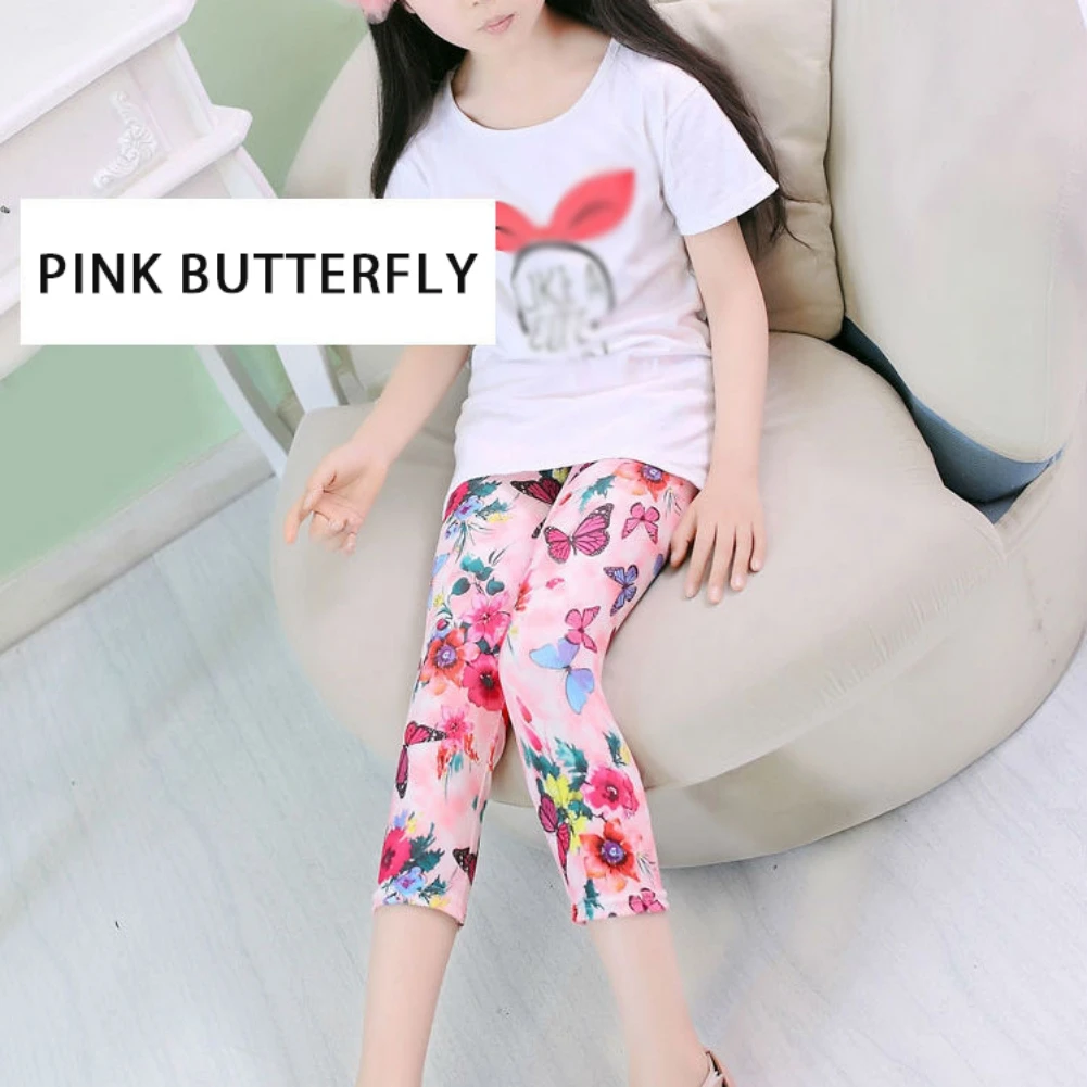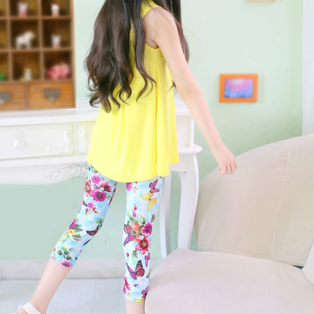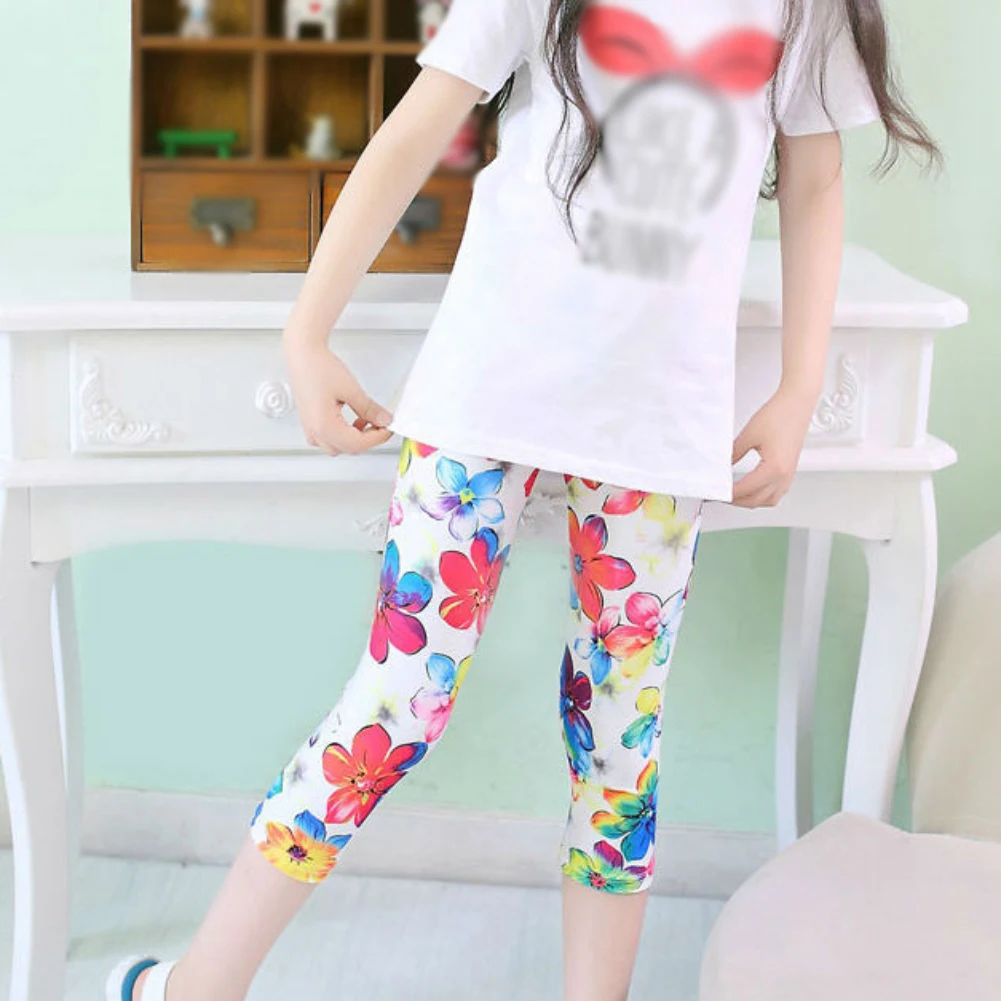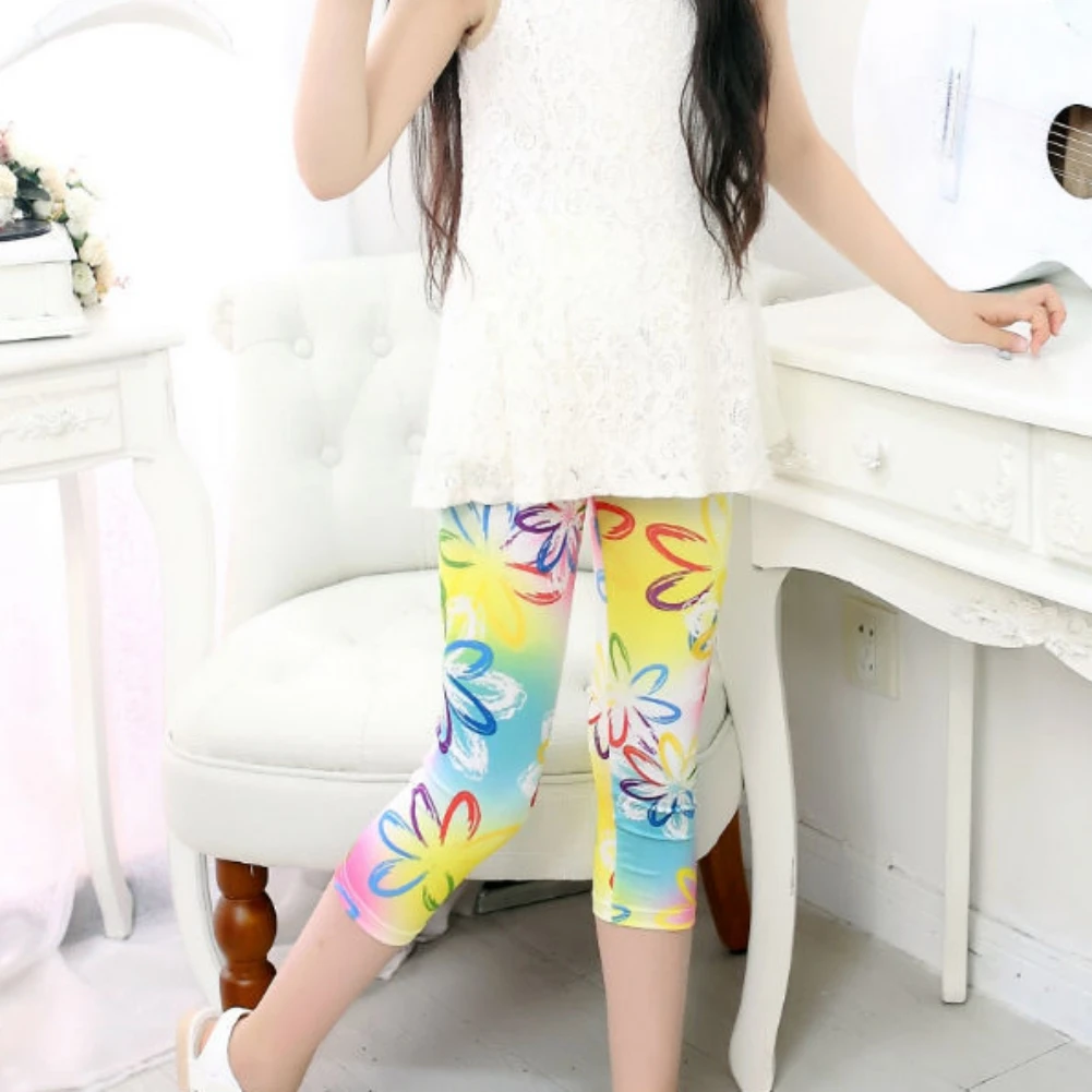 Summer Girls Seven-Point Leggings Colorful High Elasticity Breathable Leggings with Flower Print Soft Skin-Friendly Pants