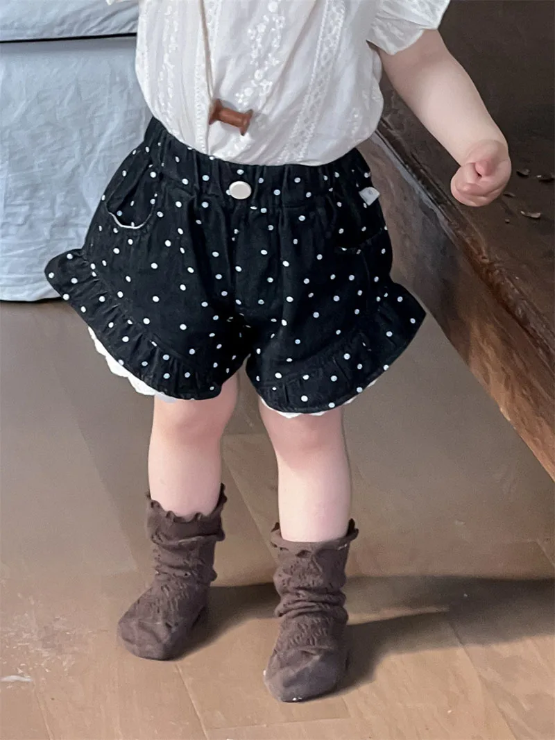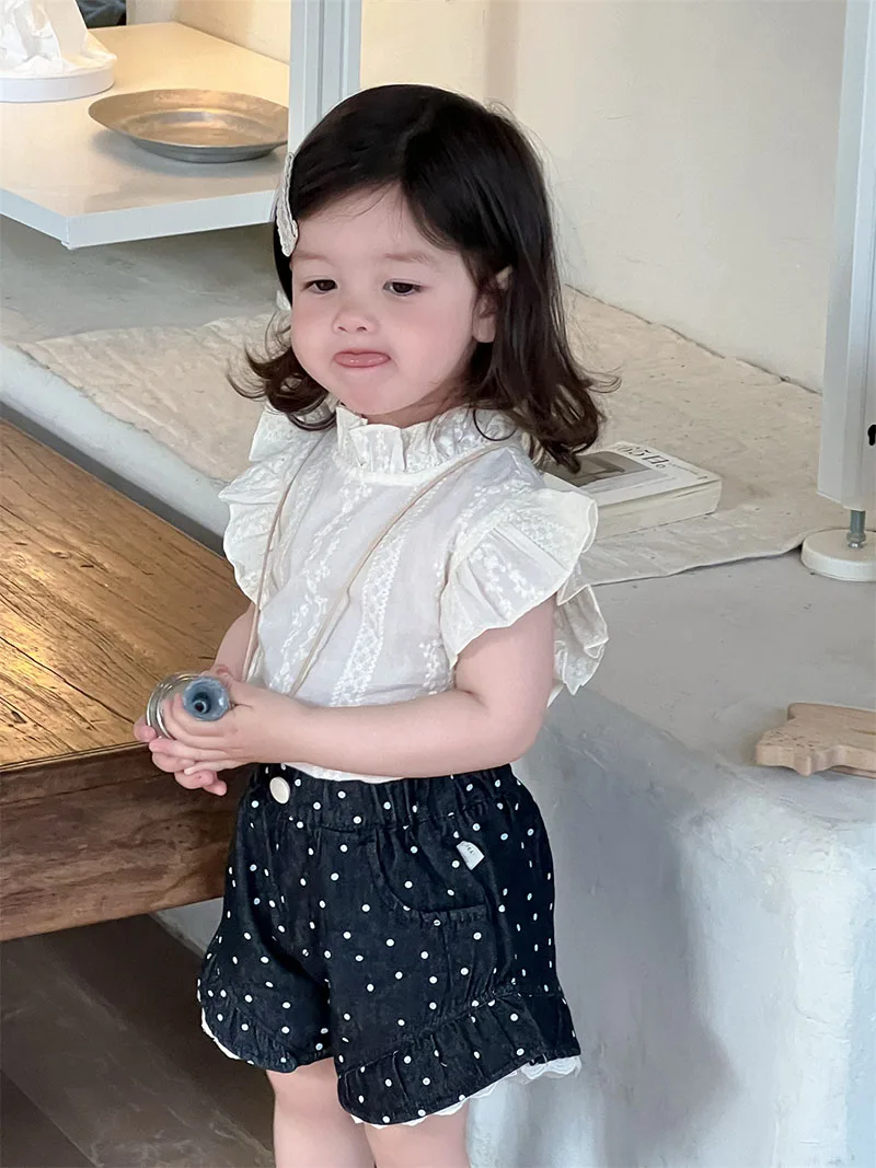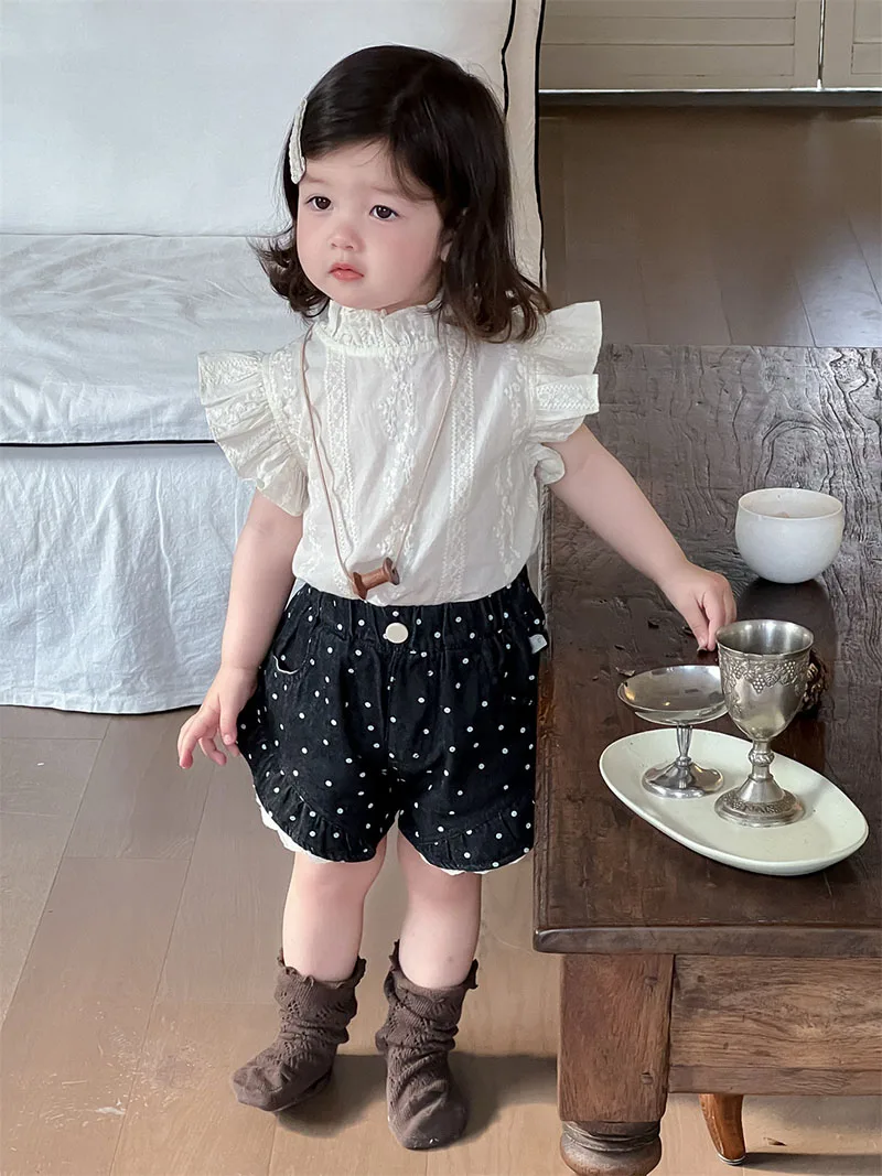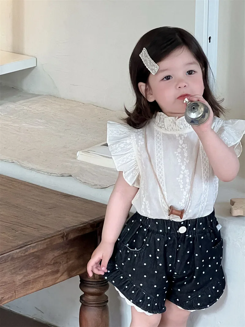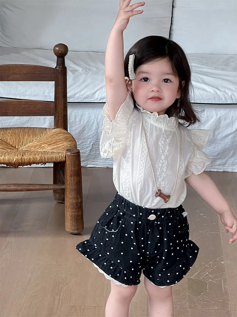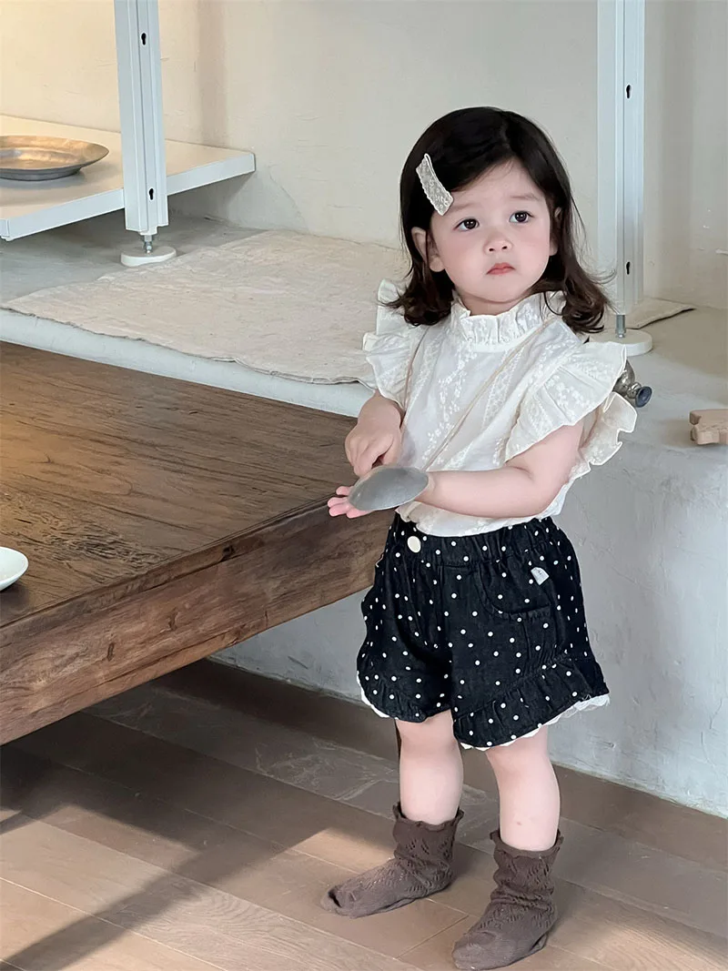 1. **Elegant Design**:This summer outfit for babies aged 9 months - 3 years combines a beige shirt with exquisite embroidery and black shorts adorned with white dots. The ruffled sleeves and high - neck design of the shirt add a touch of elegance, while the polka - dot shorts create a cute and playful look.