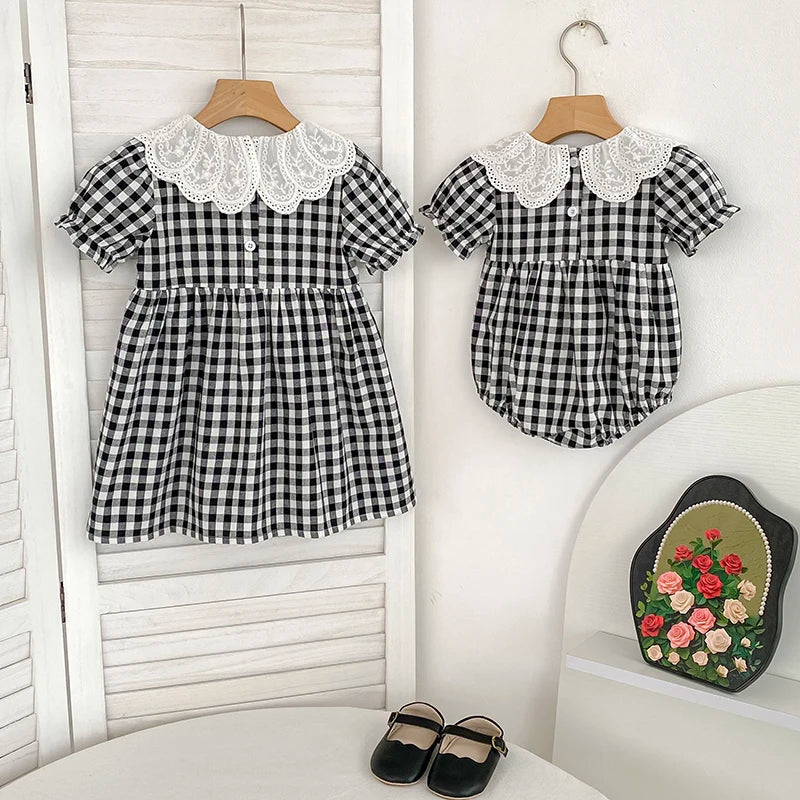 Checkered Eyelet Collar Sister Outfit