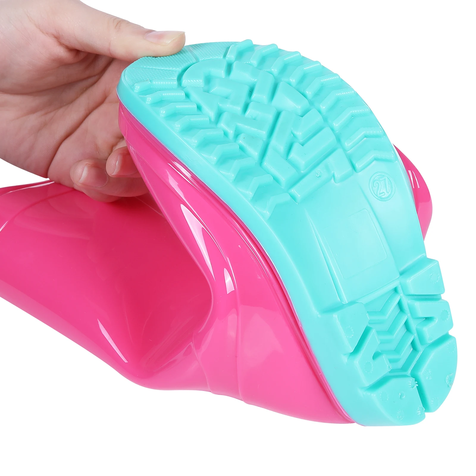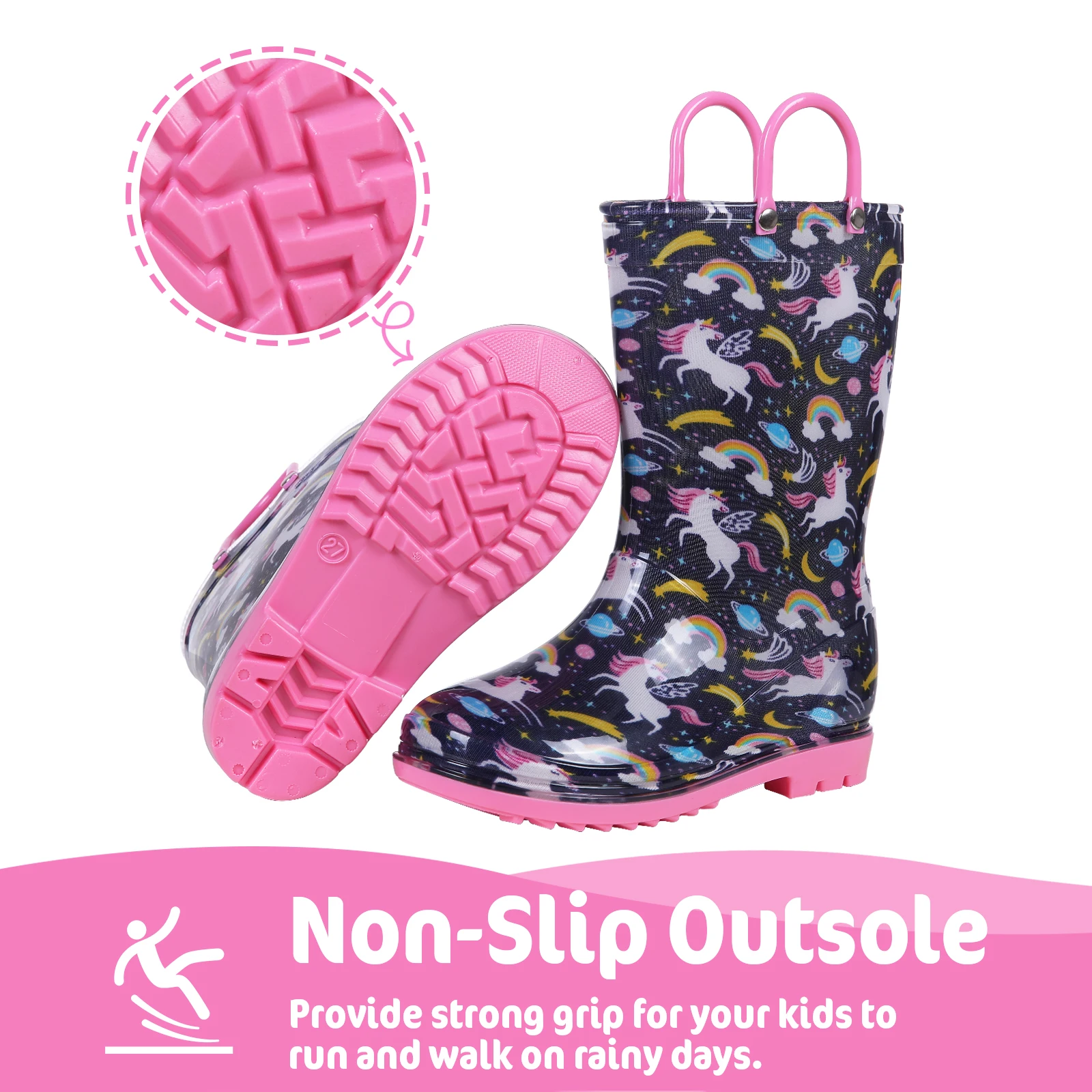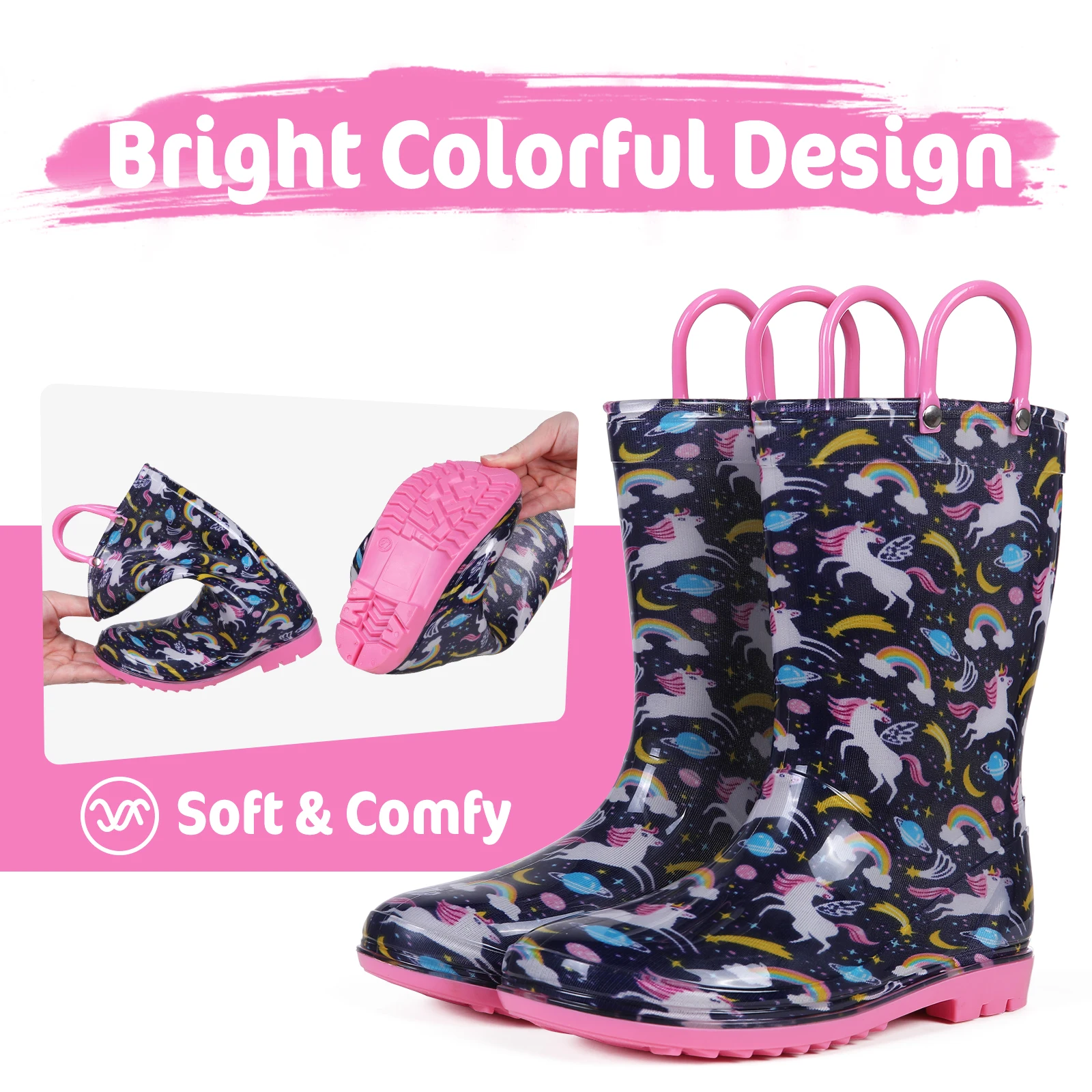 ✅【Easy On and Off】Our rain boots are ergonomically designed, and the cute round-toed shape of gives enough space for kids feet, can be flexibly bent, your kids can easily learn to put them on and off herself. There are two reinforced handles on the upper, and very convenient to carry anywhere.