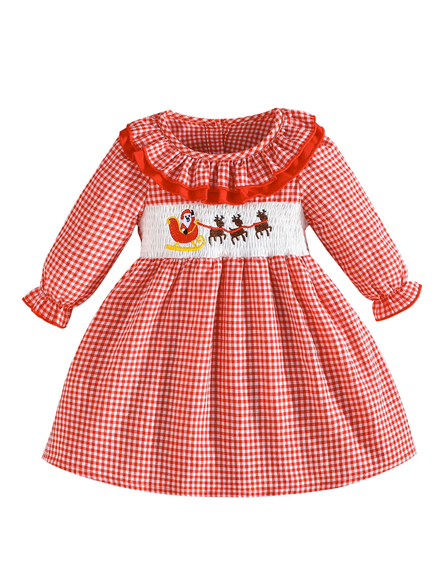 Kids Girls Christmas Dress, Long Sleeve Dress Crew Neck Plaid Embroidery Fall Dress