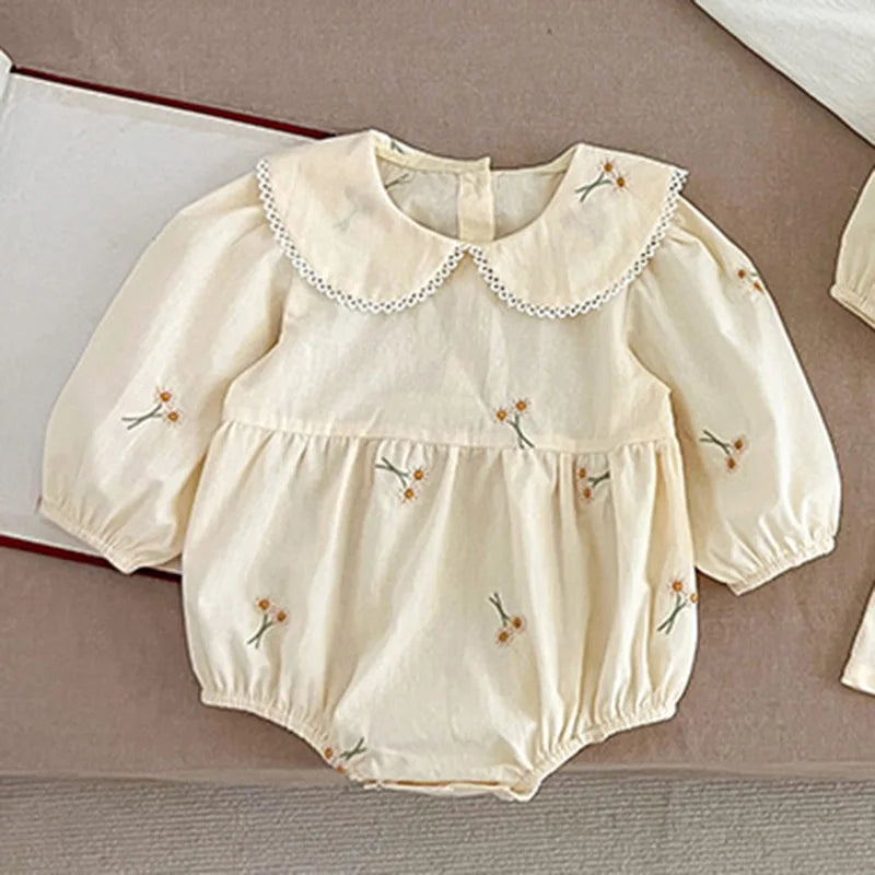 Elevate your wardrobe with this refined long sleeve romper, featuring delicate embroidered florals that add an artistic touch to your everyday style. The thoughtfully designed silhouette combines comfort with elegance, making it perfect for both casual outings and more polished occasions. Quality craftsmanship shines through in every stitch, while the long sleeves provide versatile layering options year-round. A timeless piece that effortlessly transitions from day to evening wear.