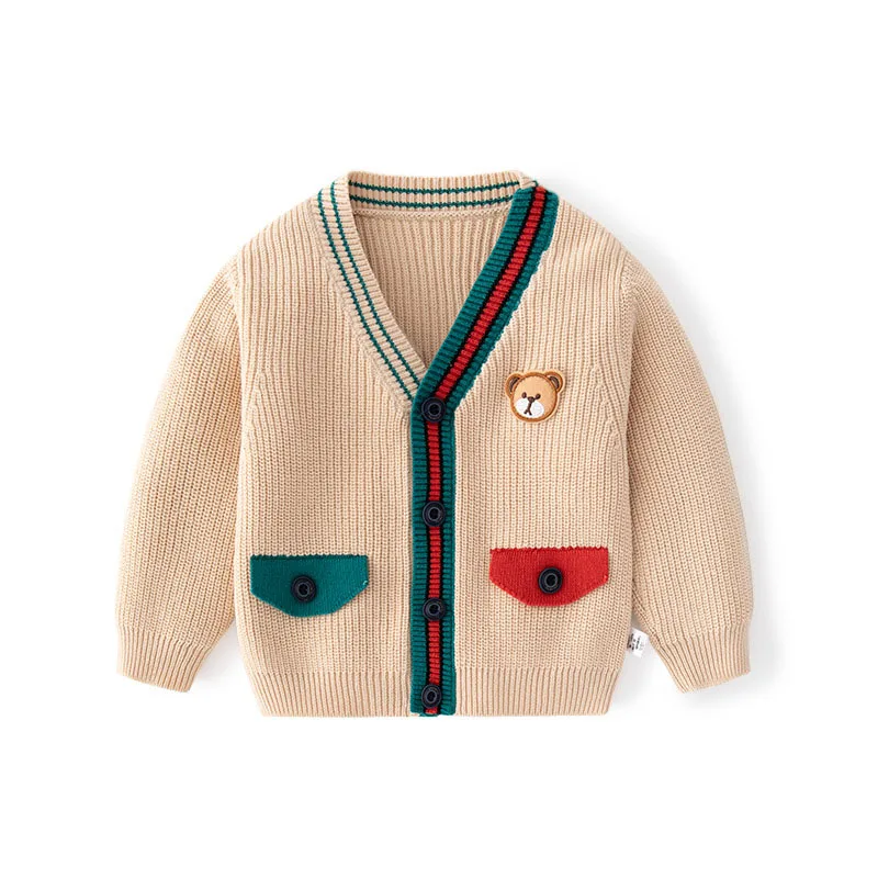 Tomas Patched Bear Cotton Buttons V-neck Sweater