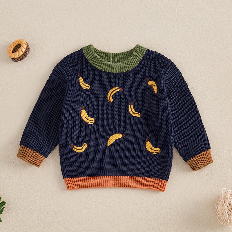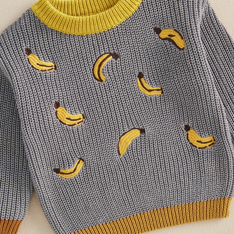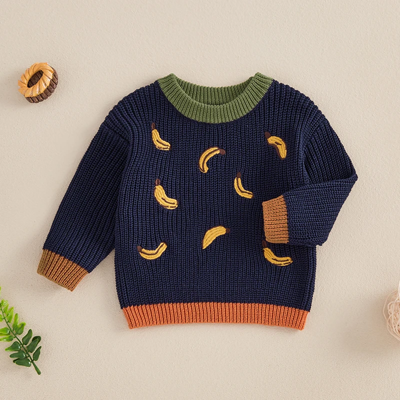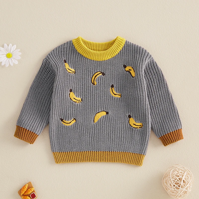 Baby Knit Sweaters Long Sleeve Round Neck Banana Embroidery Loose Pullover Infant Fall Tops