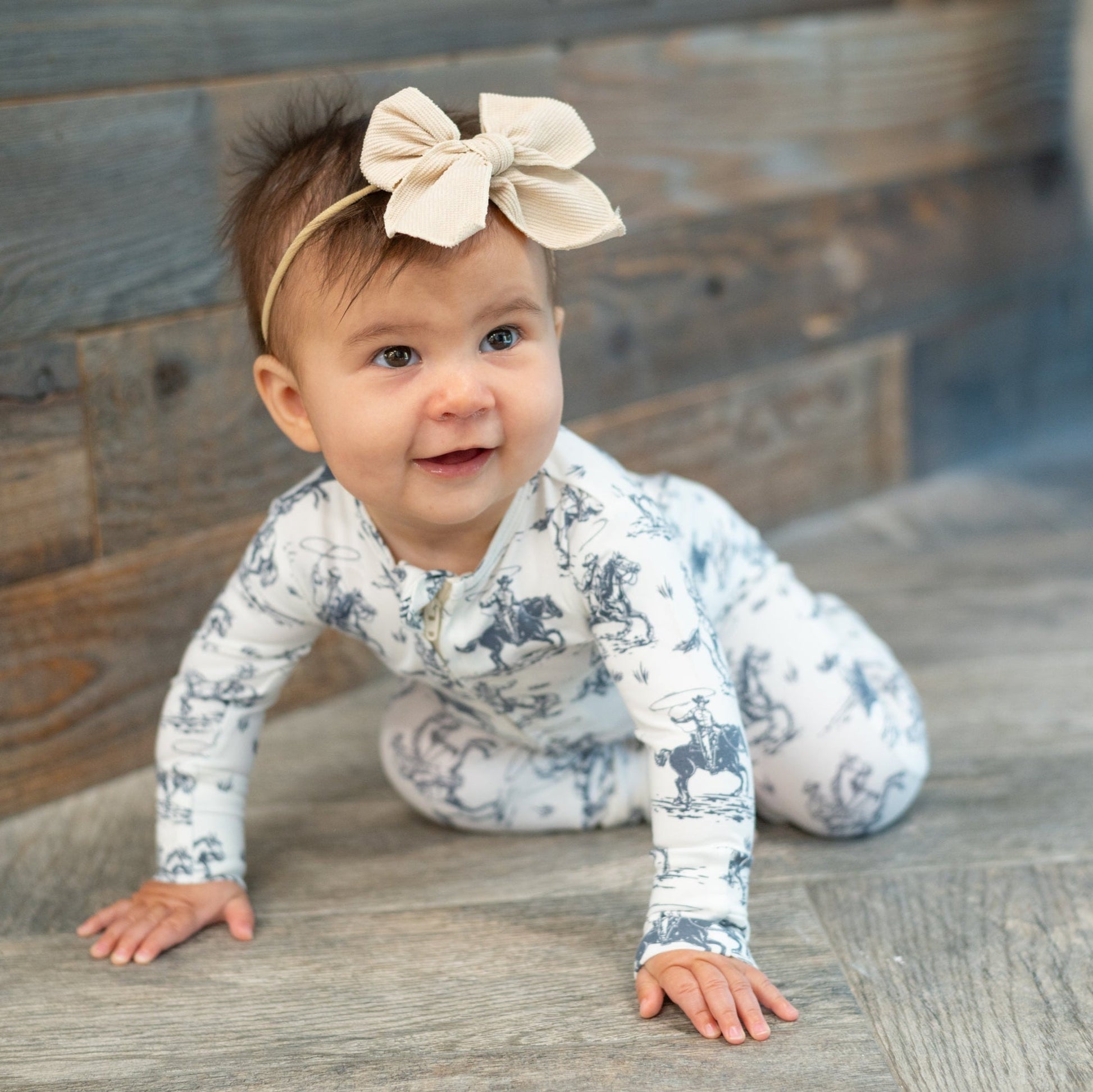Ask and you shall receive. This yummy footie is equipped with a smooth 2-way zipper, silicone grips on the foot pads and fold-over handcuffs. Plus our silky-soft fabric hugs in all the right places to show off those baby curves.