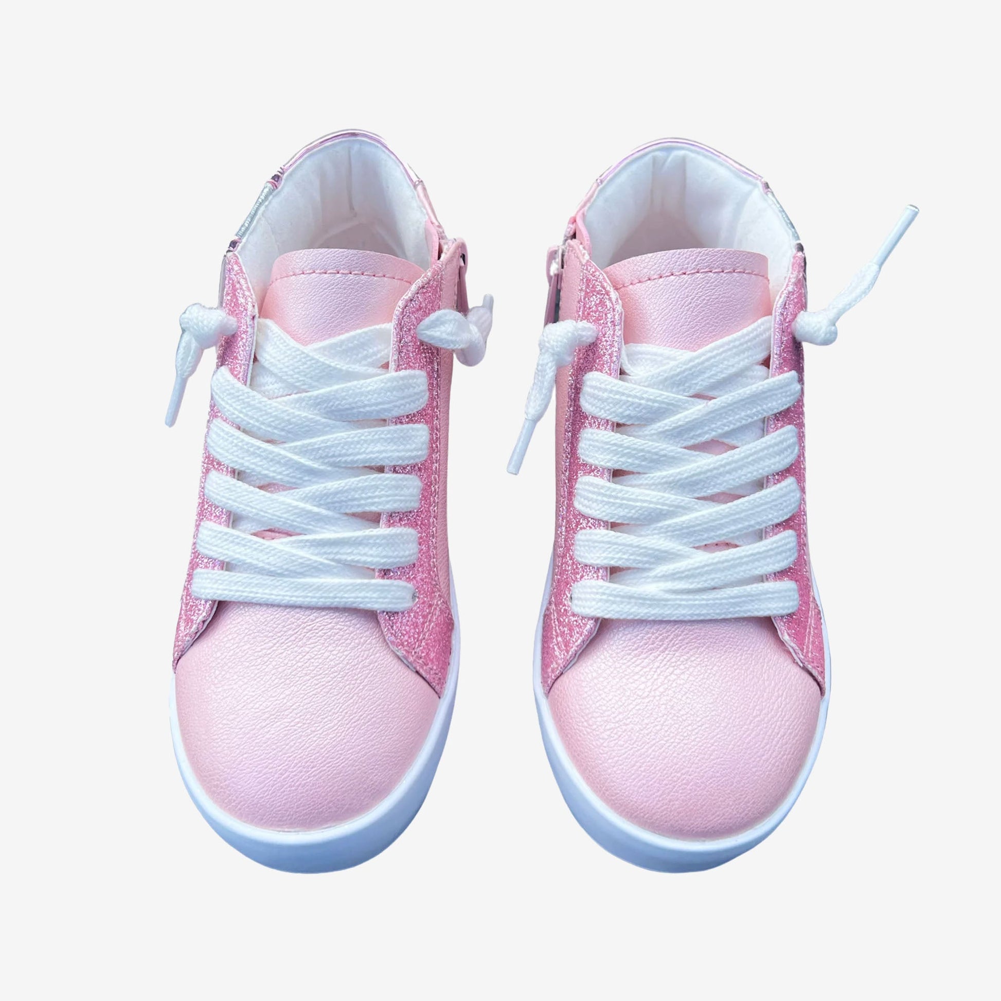 Experience the ultimate in style with our trendy pink mid tops. Featuring pink glitter accents, an inner side zipper for easy on/off, and a unique 3 star detail, these boots will make you stand out in any crowd. Plus, they're comfortable and functional, so you can wear them from day to night. Don't miss out on this must-have addition to your wardrobe!