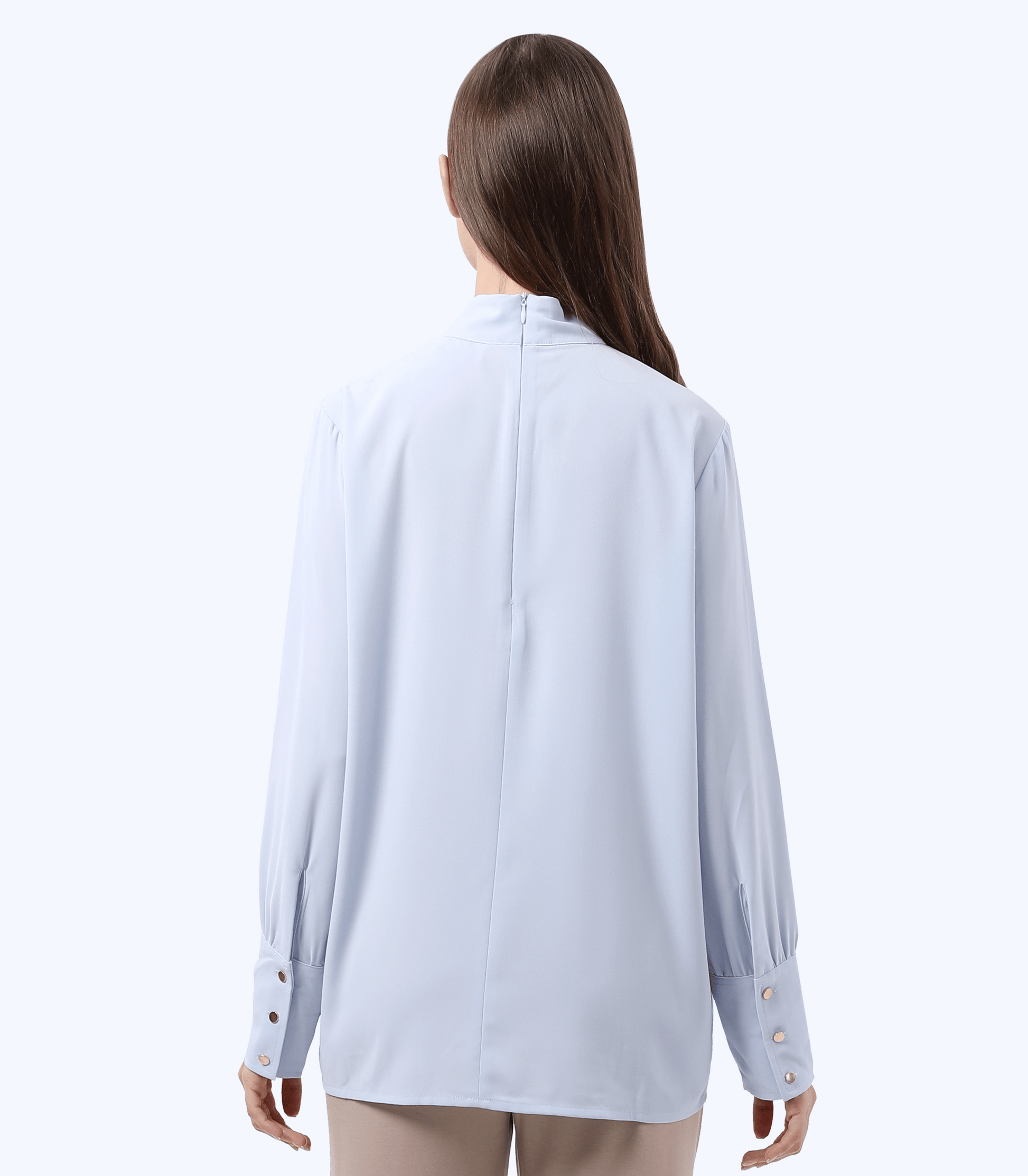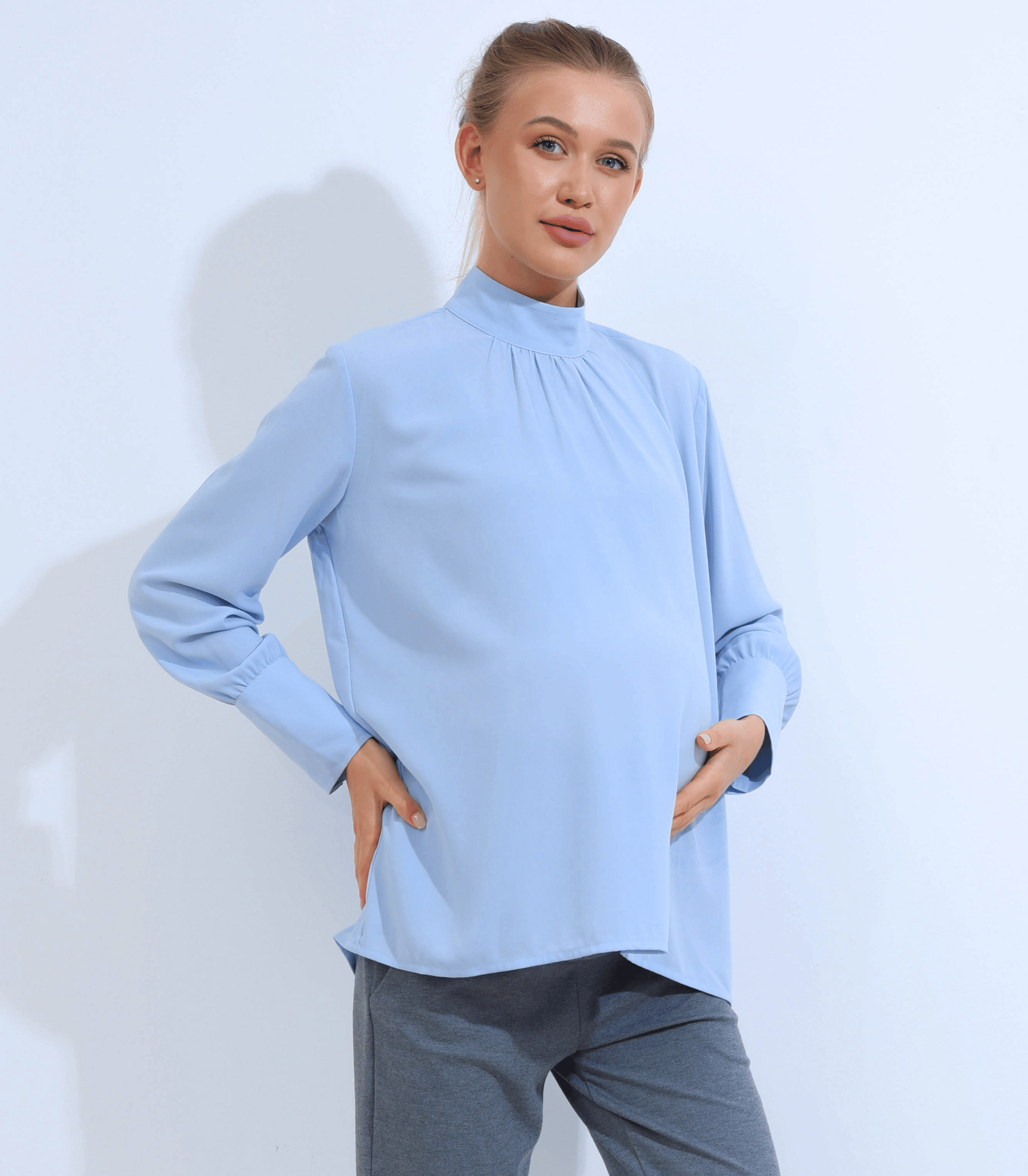 Embrace comfort and elegance throughout your pregnancy with this sophisticated sky blue maternity blouse. The mock neck design offers a polished, refined silhouette while the long sleeves provide versatile layering options for any season. Thoughtfully tailored to accommodate your changing shape, this piece transitions seamlessly from work to weekend. The soft fabric drapes beautifully, creating a flattering fit that celebrates your natural curves. A timeless wardrobe essential that combines style with the practical support expectant mothers deserve.