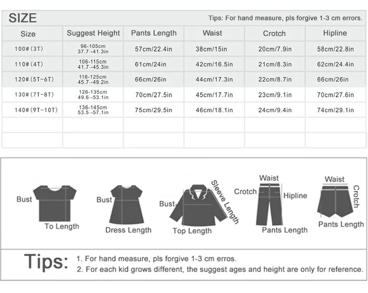 Sizes: 100(3T), 110(4T), 120(5-6T), 130(7T-8T), 140(9T-10T) Suit for 2-13Years Kids (Only for reference)