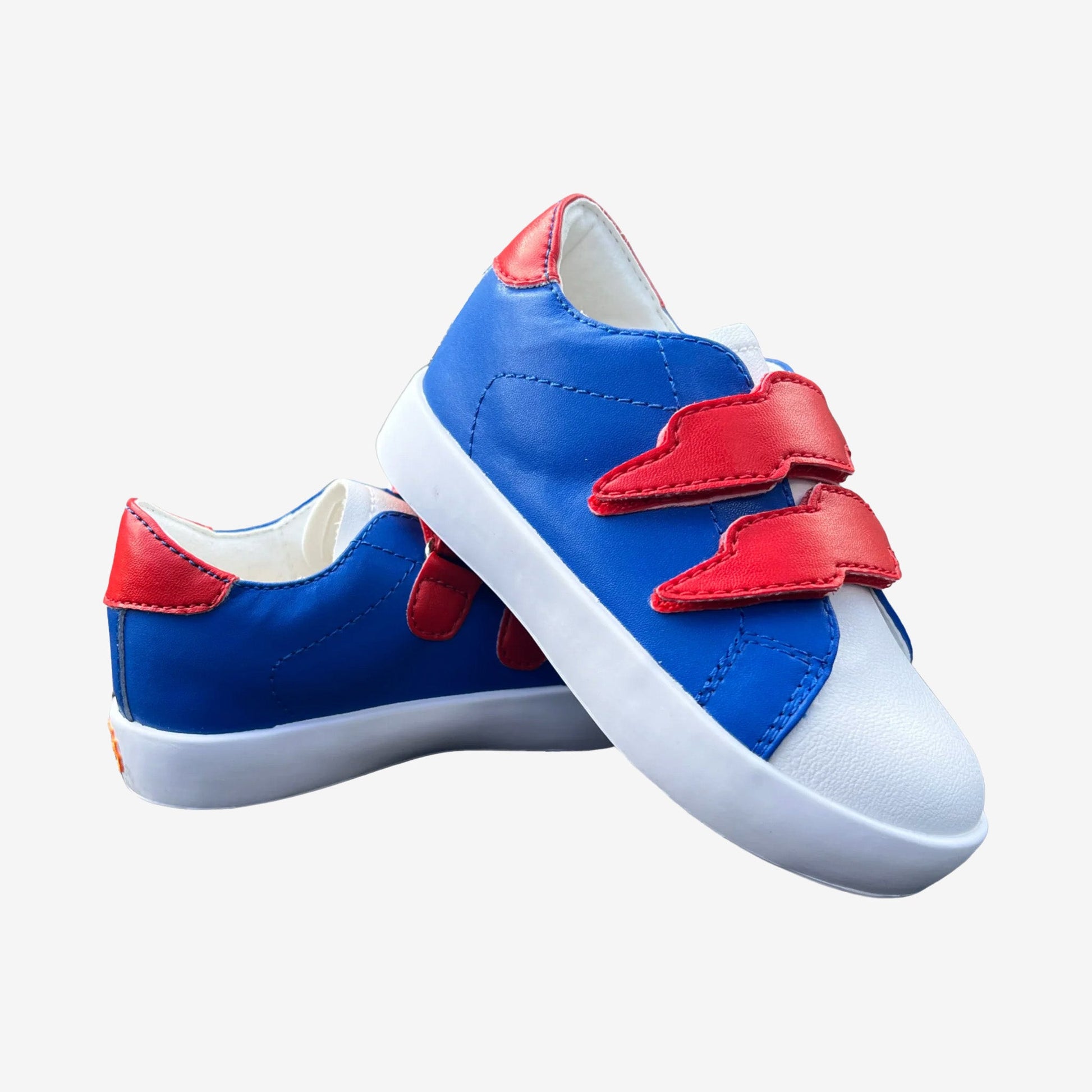 Blue PU leather upper; Red leather cushioned heel grip; White leather tongue and toe