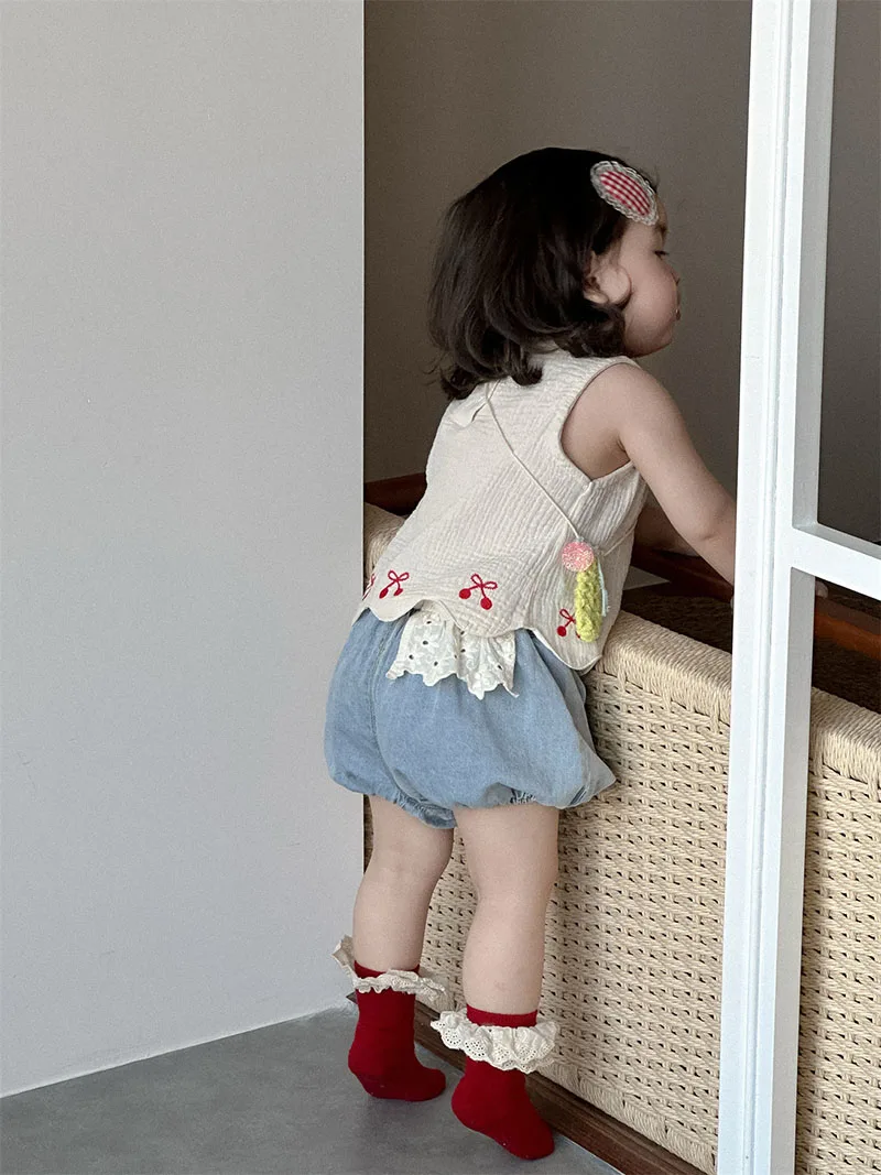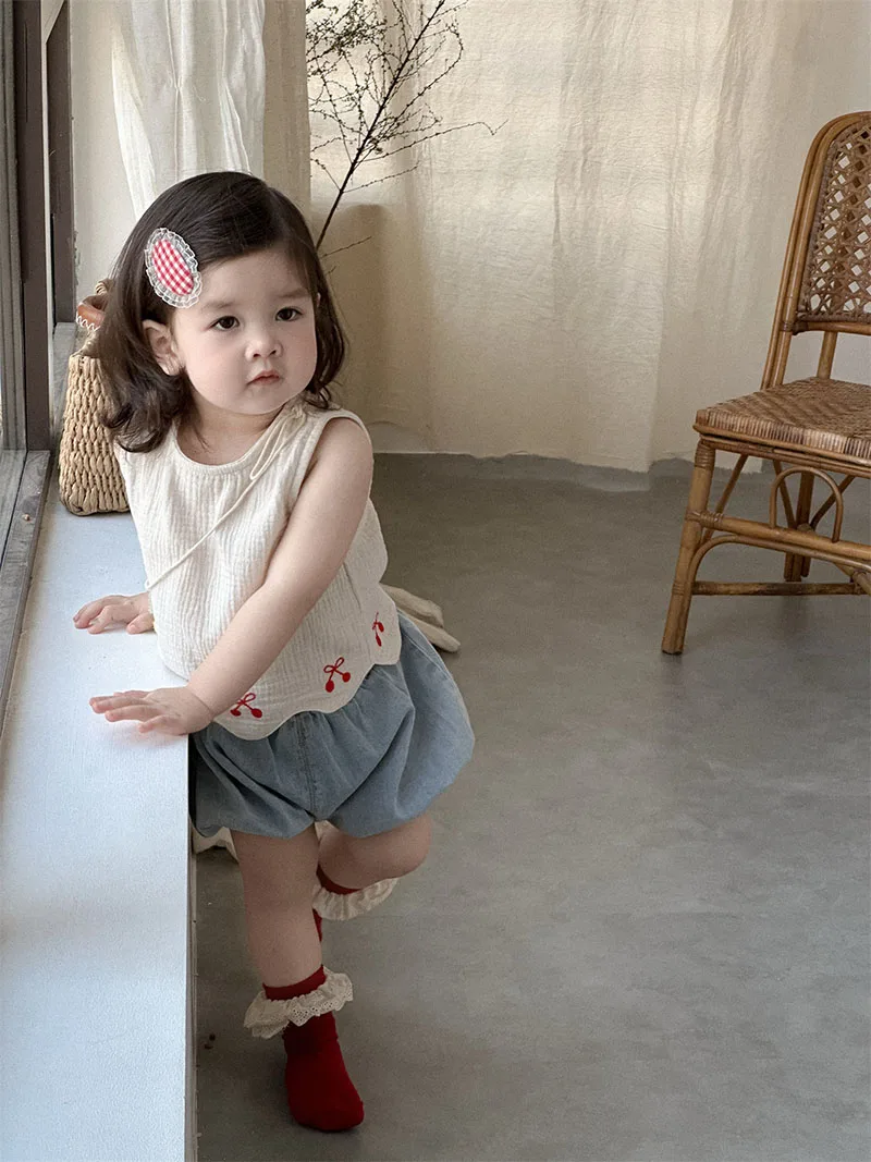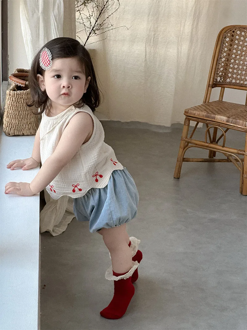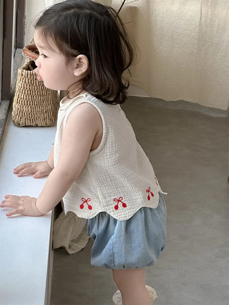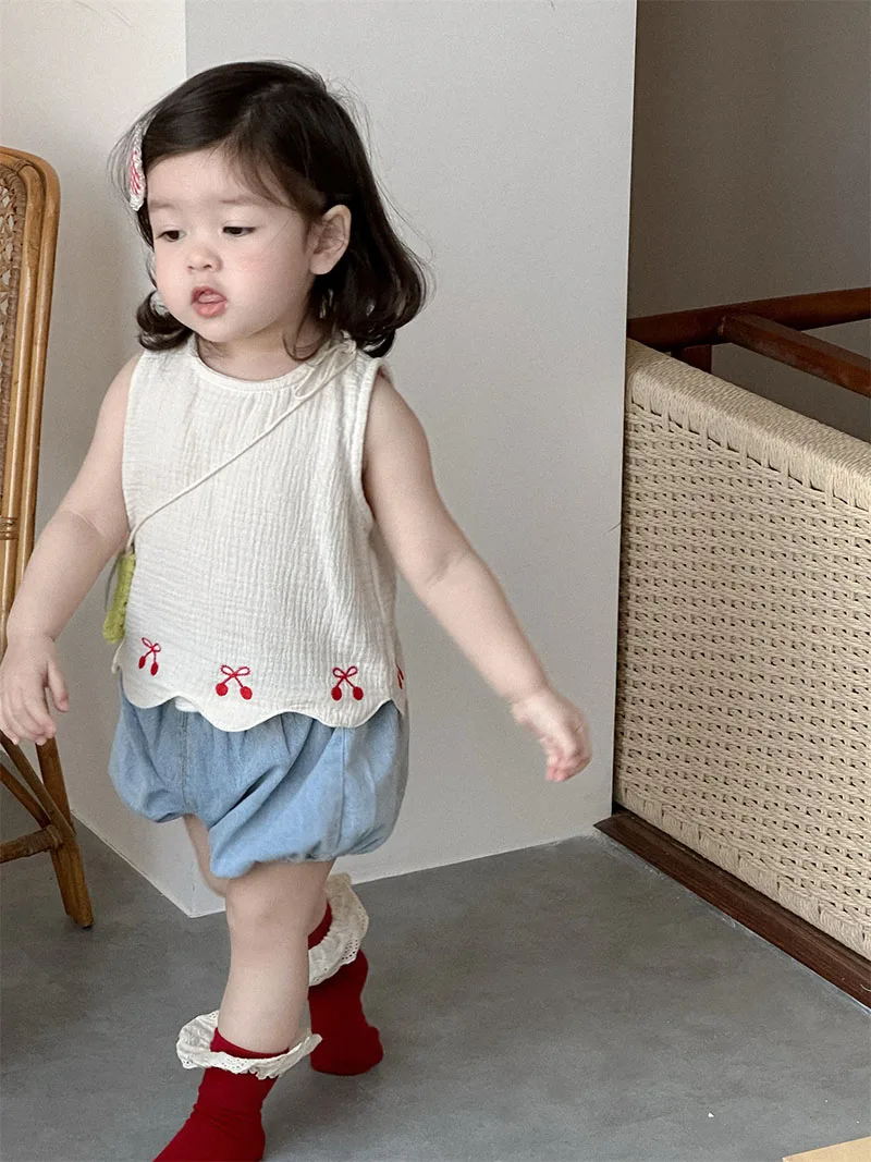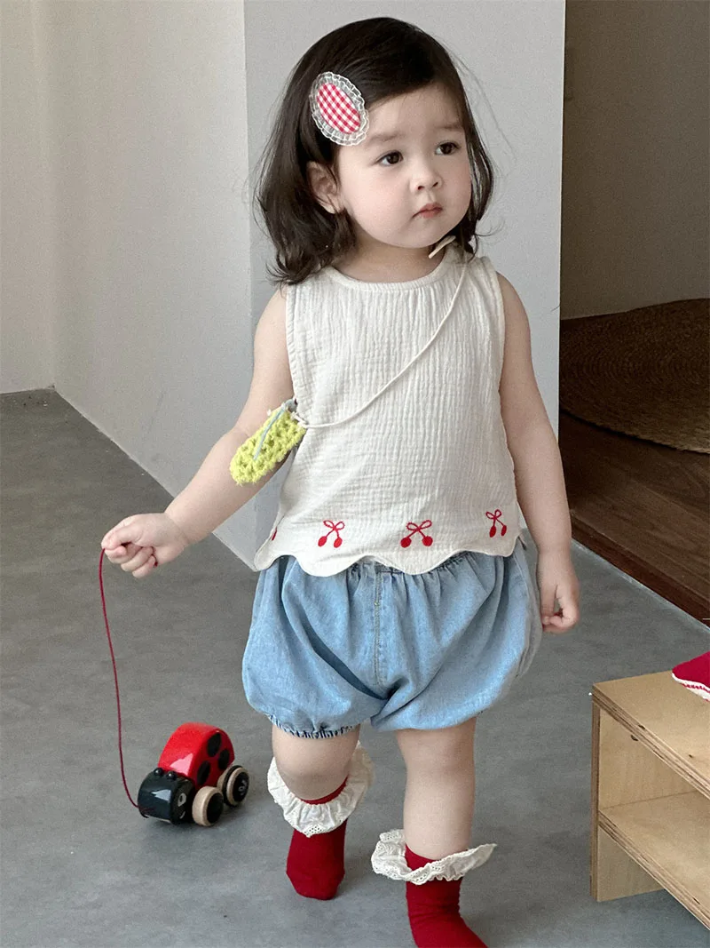 1. **Adorable Design**:This summer outfit for babies aged 9 months - 3 years features a sleeveless vest with charming red bow embroidery and scalloped hem. Paired with denim bloomers, it creates a cute and stylish look.